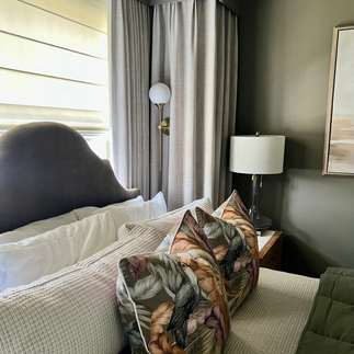 To elevate the coziness and sophistication, I opted to layer the roman shades with opulent euro pleated draperies, adding extra fabric for a fuller look. These draperies not only enhance the room's aesthetic appeal but also regulate temperature and energy efficiency, thanks to their blackout lining. Perfect for those luxurious daytime naps! Plus, they bring a hint of drama and elegance, especially when stretched across the entire width of the wall.